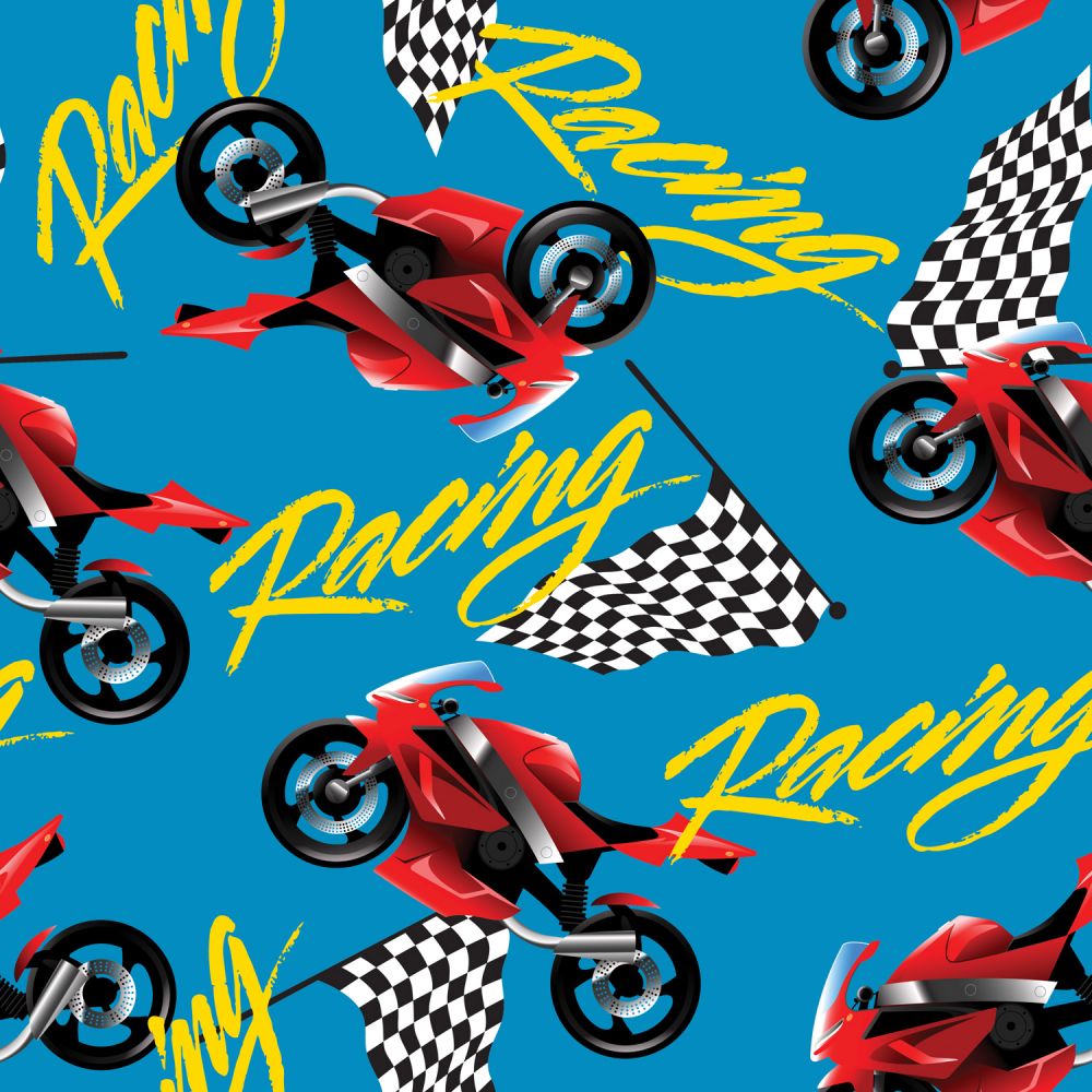 Bolt 45" Racing Motorcycles Allover Digital $3.95 Yd 15 Yards